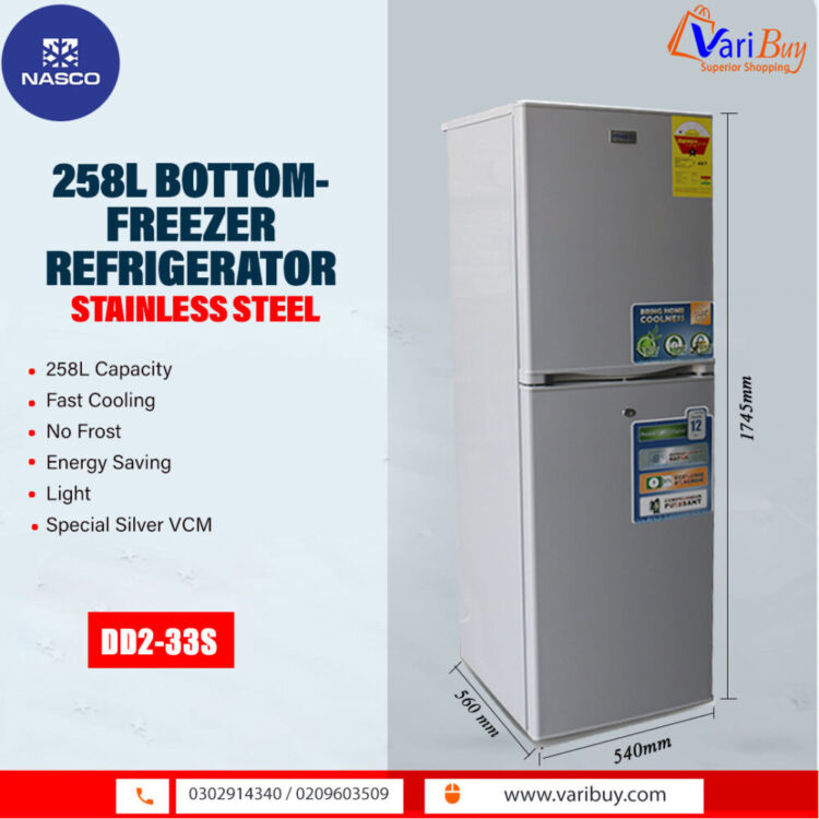 Nasco 258L Bottom Freezer Refrigerator| 246 Net Capacity, Powerful Compressor, Multi AirFlow, Fast Cooling, Energy Saving [NASD2-33]