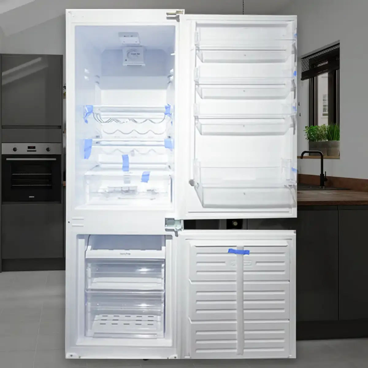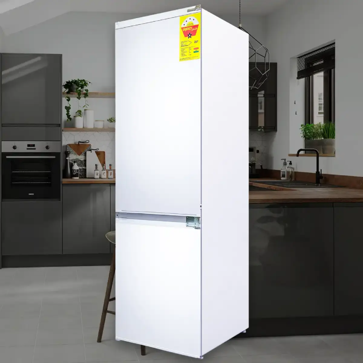 Integrated refrigerator with 170L fresh food volume and 63L frozen food volume.